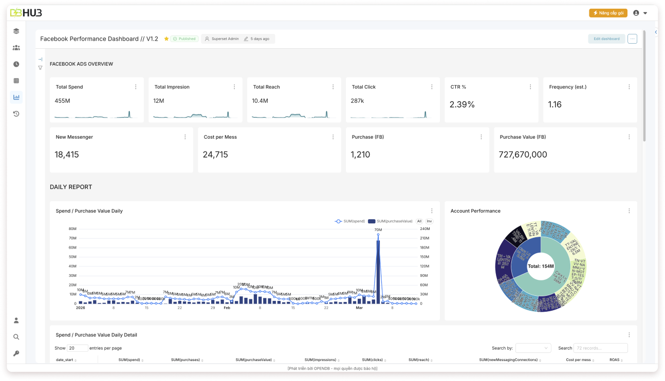 DBHub không phải realtime hoàn toàn, nhưng cập nhật rất nhanh. Tần suất sync nhanh nhất là 30 phút/lần (gói cao cấp), đủ để theo dõi hiệu quả chiến dịch trong ngày mà không cần vào từng kênh thủ công.